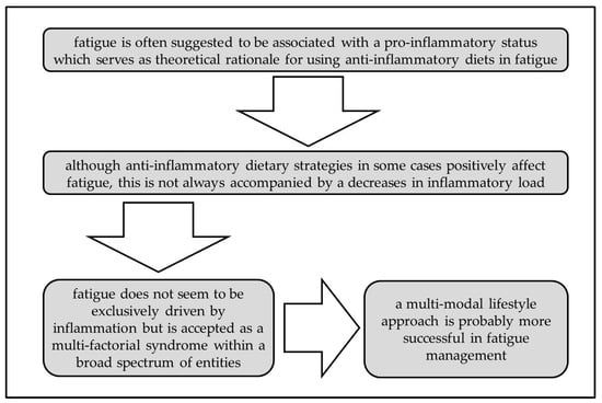 To the best of our knowledge, this is the first review summarizing the effects of anti-inflammatory dietary strategies on disease-related and idiopathic fatigue. Different anti-inflammatory nutritional approaches have been tested in various patient populations with fatigue, although studies are of inconsistent quality. Single nutritional approaches with, for example, high doses of vitamins were not always successful in reducing fatigue in the various patient populations. Nutritional interventions as complementary therapies are still quite new in the treatment of fatigue and data is lacking to support the hypothesis that vitamin and mineral supplementation, or any other anti-inflammatory nutrient, could robustly be effective in reducing fatigue symptoms. Furthermore, changes in inflammation and fatigue levels did seldom occur simultaneously. Therefore, although fatigue often has been suggested to be due to inflammation, a clear cause–effect relationship still has to be shown. This could explain why anti-inflammatory nutrients/dietary patterns are not always as effective in fatigue improvement as hypothesized. Moreover, a multifactorial etiology is likely, so that a multimodal approach (including nutritional intervention, physical activity, and psychological support among other possible nonpharmacological strategies) is necessary (Figure 2).