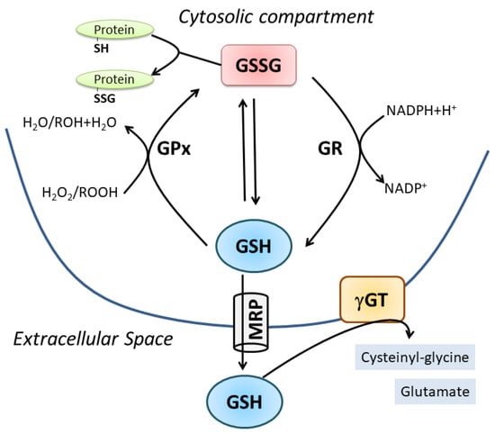 Two ATP-dependent cytosolic enzymes are responsible for the de novo synthesis of GSH: glutamate-cysteine ligase (GCL) also named γ-glutamylcysteine synthase (GCS) and glutathione synthase (GS). The first is the rate-limiting enzyme formed by a modulatory or light subunit (GCLM) and a catalytic or heavy subunit (GCLC). Using the ATP hydrolysis, GCLC is able to shape an iso-peptide bond between the γ-carboxyl of glutamate and the amino group of cysteine. GS catalyzes the addition of glycine to γ-glutamylcysteine created by GCLC to form GSH [1]. GCLC is transcriptionally regulated by Nuclear factor (erythroid-derived 2)-like 2 (NFE2L2), a transcription factor that regulates a wide array of antioxidant responsive element-driven genes in various cell types [2]. GSH degradation occurs in the extracellular space by the enzyme γ-glutamyl-transpeptidase (γ-GT), which cleaves GSH into cysteinyl-glycine (Cys-Gly) and glutamate. Thus, systemic GSH homeostasis relies on its intracellular synthesis, export and degradation outside the cell in a cycle with a half-life of 2–3 h [3]. Intracellularly, GSH is present in a dynamic equilibrium with its oxidized forms, mainly GSSG, which is the product of a disulfide bridge between two molecules of GSH directly produced upon oxidative burst or by the activity of the antioxidant enzyme glutathione peroxidase (GPx). Subsequently, GSSG is converter to GSH through the glutathione reductase (GR). GSSR represents a less concentrated form deriving from mixed disulfide formation with protein thiols (protein S-glutathionylation); however, this oxidized form is pivotal in redox signaling pathways representing a reversible posttranslational modification of proteins [4]. The value of GSH/GSSG ratio is universally accepted as index of cell redox status because of the scavenging effect of GSH against several reactive oxygen species (e.g., hydroxyl radical: OH, superoxide anion: O2−, hydrogen peroxide: H2O2, lipid peroxyl radical: HOO), either directly or through the activity of antioxidant enzymes, mainly the glutathione peroxidases. GSH homeostasis is fundamental for cell metabolism and function as stated by the association of altered GSH levels with numerous conditions and pathologies such as aging, neurodegeneration, cancer, inflammation and muscle degeneration (Figure 1) [5,6,7,8].