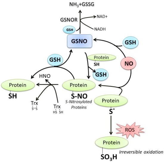 Along with the formation of GSNO after reaction with GSH, NO can readily react with the sulfhydryl group (-SH) of protein cysteine residue to form S-nitrosocysteine that consists of a redox-mediated posttranslational modification. S-nitrosylation is a reversible process that can affect the structure/function of the target cysteine, therefore it can be considered a way through which redox-mediated cellular signal is transduced as well as an endogenous reservoir for NO endocrine functions. De-nitrosylation, the process reforming the thiol group, requires a thiol-based molecular mechanism centered on GSH and thioredoxin (Trx) by means of non-enzymatic thiol exchange. Trx is a small molecular weight protein with reactive cysteine residue performing reduction of oxidized thiol-derivatives; in the de-nitrosylation process two vicinal cysteines in the protein become oxidized while the nitrosothiol is reduced producing free nitroxyl (HNO) or NO, then Trx is efficiently reduced by the NADPH-dependent activity of Trx reductase enzyme. GSH-dependent protein de-nitrosylation occurs through a nitrosylation exchange mechanism that generates GSNO, which can be a substrate of the enzyme S-nitrosoglutathione reductase (GSNOR) that finally produces GSSG and ammonia (NH3) [38,39,40]. A great number of proteins (about 240) are found to undergo S-nitrosylation: 70% of them were identified under physiological conditions, 12% under various pathological conditions and 15% may be ascribed to both conditions. Most of these proteins are located in the mitochondrial intermembrane space and the inner mitochondrial membrane. As regards the biological function, a significant proportion of them is involved in the generation of precursor metabolites and energy, including glucose metabolism, and oxidative phosphorylation [38].