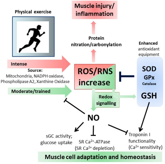 Oxidative and Nitrosative stress/signaling during intense and moderate physical exercise. For details see the text.
