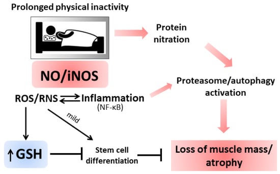Increased oxidative/nitrosative stress and inflammation are also features of inactivity-mediated skeletal muscle atrophy [118,119]. Atrophy is defined as a reduction in muscle mass due to disease or disuse characterized by an altered protein turnover with increased degradation with respect to synthesis. The physical inactivity induces protein ubiquitination and autophagy biomarkers [120]. Atrophic muscles were characterized by a significant increase in TNF-α, NF-κB, IL-6 levels [121,122] and in ROS production by dysfunctional mitochondria [123]. The cytokines produced during long periods of inactivity determine, in turn, NF-κB-mediated transcription of iNOS and the production of ROS/RNS at the mitochondrial and cytosolic level [124,125]. Increased NO flux can cause modification on tyrosine residues that induced the ubiquitin-proteasome pathway enhancing skeletal muscle apoptosis and atrophy [126,127]. Experimental bed rest for 35 days induced oxidative damage and cytokine production in human vastus lateralis fibers and significant muscle mass reduction. In addition, a significant increase in GSH availability was determined and considered as an antioxidant response to a previously elicited ROS/RNS production [128]. Increased activity in xanthine oxidase was reported as a cause of the increased level of ROS in soleus muscle atrophy induced by hindlimb unloading for 14 days. The molecular mechanism depicted was via activation of Mitogen-activated protein kinase p38 (p38 MAPK) and the E3 ubiquitin ligase Atrogin1/MAFbx, the latter being up-regulated during immobilization also in humans and involved in increased proteasome activity [129].