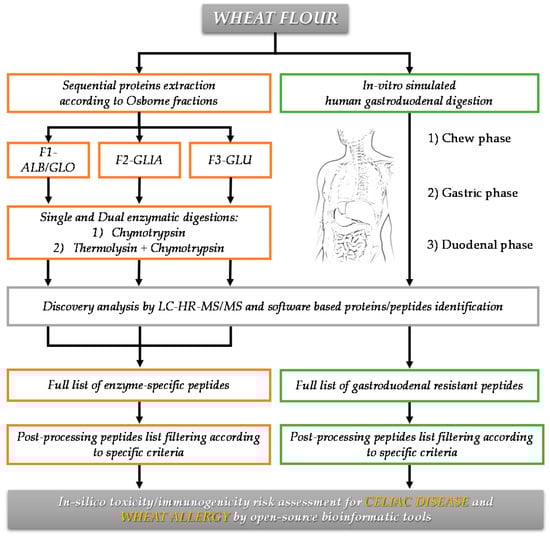 In accordance with this input, in the present work we carry out an in-depth analysis of the proteomic profile of the wheat genotypes previously selected. An advanced proteomic approach was carried out combining the information provided by: (i) the comprehensive protein identification of protein fractions (albumin/globulin and storage proteins); and by (ii) the identification of gastroduodenal resistant peptides which survive the proteolytic activity of digestive enzymes and, as such, pose a risk for celiac disease and wheat allergy patients. The latter was applied directly to raw flours, according to the standardized static protocol proposed by Minekus et al. in 2014 [16]. The peptide pools generated in all the steps were analyzed by liquid chromatography high resolution tandem mass spectrometry in data dependentTM acquisition mode with an instrumental method tailored to widen the amount of information retrieved and a dual-round software-based sequence identification. The full list of enzyme-specific peptides and gastroduodenal resistant peptides were filtered according to specific criteria of reliability for the highest confidence in sequence identification, and finally, the refined list was screened for in silico toxicity/immunogenicity risk assessment in order to tackle implications for celiac disease and wheat allergy.