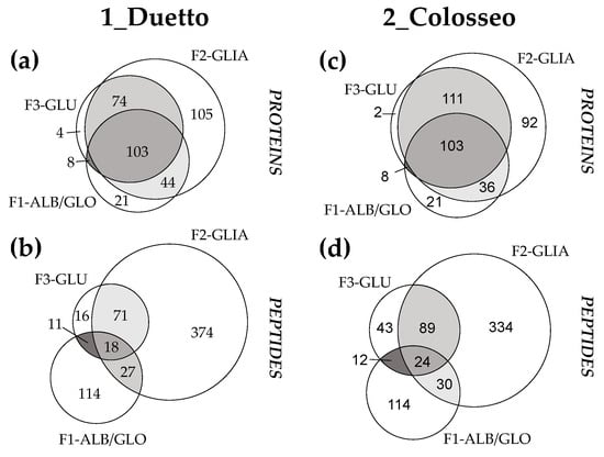 As an example, the distribution of identified proteins (panels (a) and (c)) and peptides (panels (b) and (d)) among the three different fractions were displayed for wheat varieties labeled as 1 and 2, but the same general trend was highlighted for the other samples. Some protein accessions and most of the peptide sequences were uniquely identified in a specific fraction; however, some others were actually shared among the fractions. Significant overlapping was observed between the fractions F2 and F3, related to storage proteins, and this evidence was ascribed to two main reasons: (i) the partial extraction of some glutenin subunits already in the ethanolic fraction; (ii) the sequence homology between LMW-GS and gliadins, which affects the proper peptide/protein identification [24].