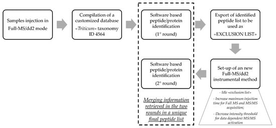 The workflow is described in Figure 3. Briefly, we performed a first round of discovery analysis in which the instrumental set-up was based on a common data dependentTM template for untargeted peptide analysis, the same one was applied for characterization of enzyme specific digests of Osborne fractions. The MS/MS spectra collected were processed via PD by setting the general parameters itemized in Section 2.6. In this case, we set a wide mass accuracy (10 ppm), due to the expected matrix complexity being higher than the Osborne fractions. Notably, given the high heterogeneity and low specificity of the proteolytic cleavage occurring in the different GD digestion phases, we applied the ‘unspecific’ cleavage option for database indexing. With this option, the software automatically calculates all the possible hydrolyzed peptides in any available site within the mass range set for the indexing. This raises exponentially the processing time and the amount of data generated; therefore, we selected for this experiment a restricted database containing only the Triticum taxonomy (ID 4564). Theoretically, using different databases for protein/peptide identification can cause bias in the final list of accessions and peptide sequences detected. To exclude this drawback, we carefully screened the final list of protein accessions detected in the CHY and THE/CHY digests with the Poaceae database and we assessed that all the top-scored proteins belonged to either the Triticum taxonomy or the Aegilops, the latter being diploid ancestor of hexaploid wheat.