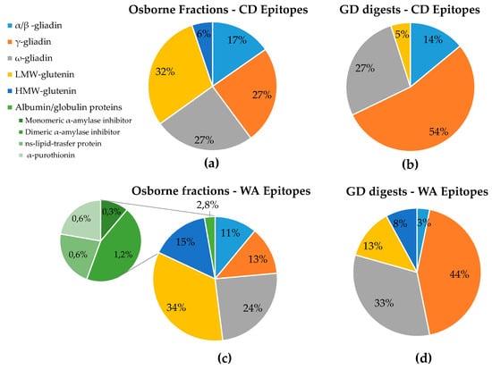 As for CD, the epitopes belonged only to storage proteins (see panels (a) and (b)). The distribution of epitope-containing peptides was quite homogeneous for the discovery analysis accomplished on Osborne fractions (Figure 4a), ranging between a minimum of 17% for α-gliadins and a maximum of 32% for LMW-GSs; in contrast, HMW-GS epitopic sequences accounted for only 6% of the total hazard sequences. Notably, when performing the same analysis on GD digests, the final distribution among storage proteins changed dramatically. Indeed, all the HMW-GS and most of the LMW-GS epitopic sequences were not detected at the end of the duodenal digestion phase, and α-gliadins and ω-gliadins persisted almost unchanged, while most of the hazard peptides belonged to γ-gliadins (see Figure 4b). These results support the hypothesis of a differential resistance of the aforementioned proteins to the hydrolytic activity of digestive enzyme. Notwithstanding their higher toxicity, the α-gliadins were proved to be more susceptible to proteolytic degradation by pancreatic enzymes than the γ-gliadins. Indeed, they are almost completely hydrolyzed, except for the main immunogenic peptides [28].