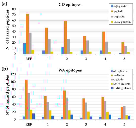Focusing on the CD epitopic peptides distribution among different genotypes and specific proteins, we reported in Figure 5a the general trend observed in GD digests. Interestingly, the selected lines coded for a reduced number of hazard peptides for all gliadin and glutenin types, but particularly for the α-gliadins. Due to the high sequence homology between γ- and ω-gliadins, the count of hazard peptides might be slightly overestimated for these two categories.