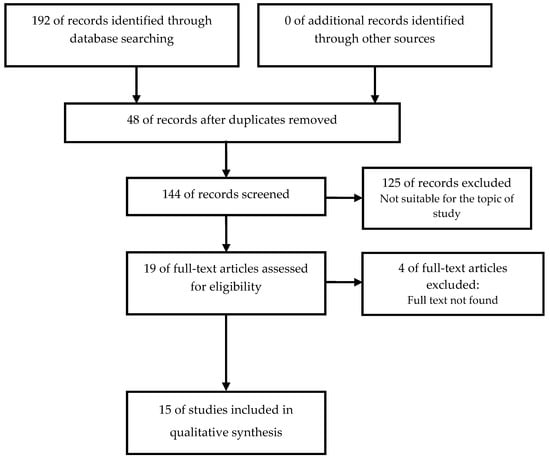 When applying the described search criteria, a total of 192 references were retrieved: 88 (45.83%) in EMBASE, 42 (21.87%) in Scopus, 38 (19.79%), 18 (9.38%), in MEDLINE, 6 (3.12%) in Web of science, and 0 in LILACS. From all the identified articles, 48 (25%) were rejected because they were duplicated in more than one bibliographic database. After applying the inclusion and exclusion criteria (Figure 1), of the remaining 144 (75%), 15 studies (7.81%) were accepted for review and critical analysis (Table 2).