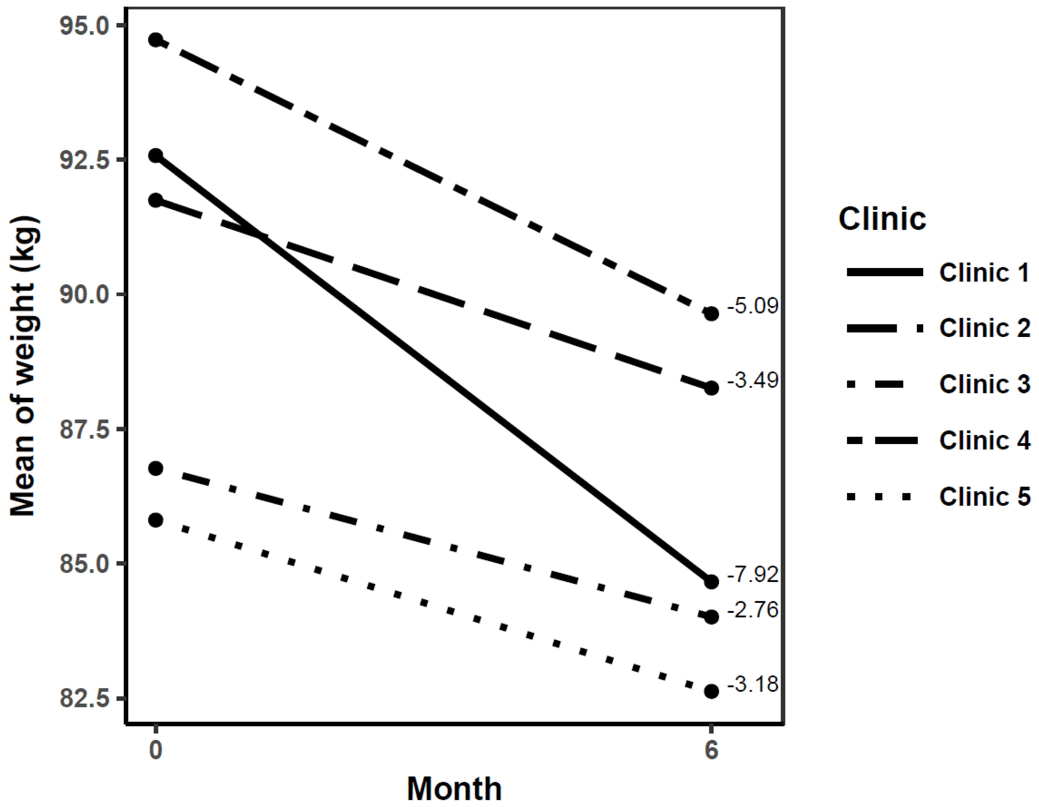 | Clinic 5 | 33.2 ± 5.17 | 32.0 ± 4.96 | −1.26 ± 1.55 1 | <0.001 | |