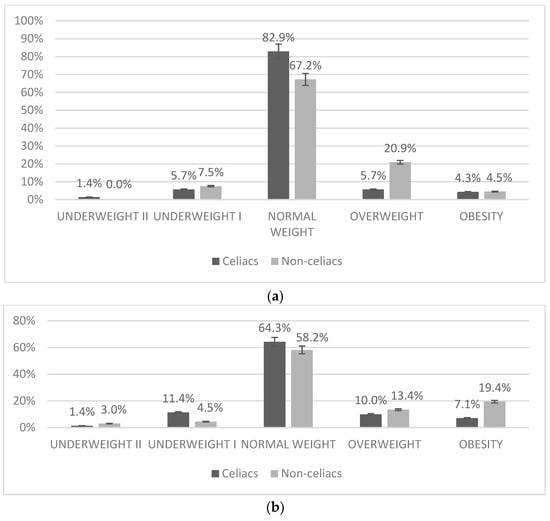 Table 8 shows anthropometric characteristics of the total sample, comparing celiac patients and non-celiac children and adolescents, and categorized by sex and age group. No differences were observed in the parameters studied (weight, height, BMI, body fat percentage) between celiac and non-celiac children and adolescents. Over 62% of the sample, both celiac and non-celiac may be classified as normal using body fat percentage cut-off points [33].