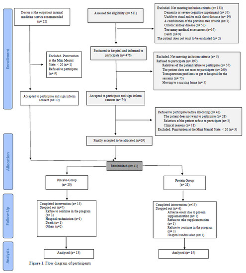 During the recruitment period, a total of 476 hospitalized patients were evaluated and invited to participate in the study. From them, only 74 (15.5%) accepted to participate, whereas the remaining 402 patients refused to participate (83.4%) or did not meet inclusion criteria (1.15%). Finally, from the 74 patients who accepted to participate, a total of 29 participants (39.2%) were randomized for the study. Overall, 93.9% of the evaluated hospitalized patients did not participate in the study due to inclusion criteria or rejection to participate in the program. Regarding the recruitment from the outpatient internal medicine service, a total of 22 patients were recommended to participate, 40.9% of these patients refused to enter the intervention program or did not meet inclusion criteria (4.5%), whereas 54.54% accepted. In total, 41 patients were randomized for the intervention program, 20 entered the Placebo-group and 21 the Protein-group. From the allocated participants, 13 did not complete the 12 weeks of the intervention program (7 from the Placebo-group and 6 from the Protein-group). The main reason for dropping out from the study in both groups was that participants refused to continue in the program (15.0% of the randomized patients in the Placebo-group and 14.3% in the Protein-group). In the Protein-group, an adverse event was reported with protein supplementation regarding itchy throat and difficulties to inhale, whereas another participant refused to take the protein supplement, so both participants were dropped from the study (Figure 1). Baseline characteristics of the recruited participants can be found in Supplemental Table S1.