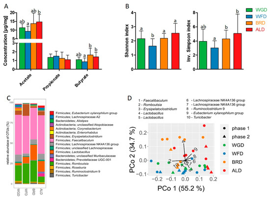 - den Besten, G.; Lange, K.; Havinga, R.; van Dijk, T.H.; Gerding, A.; van, E.K.; Muller, M.; Groen, A.K.; Hooiveld, G.J.; Bakker, B.M.; et al. Gut-derived short-chain fatty acids are vividly assimilated into host carbohydrates and lipids. Am. J. Phy. Gastrointest. Liver Physiol. 2013, 305, G900–G910. [Google Scholar] [CrossRef] [PubMed]