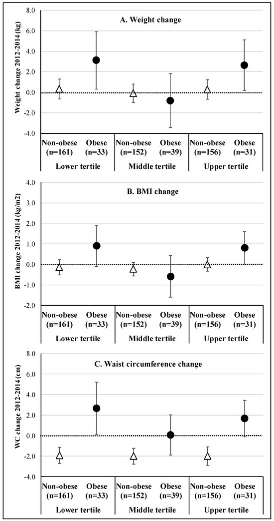 The results of the association analysis between vitamin D intake (in 2012) in tertiles and the changing variables (weight, BMI, and WC) between 2012 and 2014, stratified by the presence of obesity at baseline, are presented in Figure 2. Among non-obese individuals, both weight and BMI remained stable between 2012 and 2014 (Figure 2A,B, respectively), while WC had a mean reduction of −2.0 cm (Figure 2C), regardless of vitamin D intake tertile. Among obese individuals, a U-ratio was observed between vitamin D intake and changes in the three outcomes, with individuals in the extreme categories of vitamin intake (lower and higher tertile, respectively) presenting an approximate mean gain of 3.0 kg in body weight, 0.9 kg/m2 in BMI, and 1.7–2.7 cm in WC.