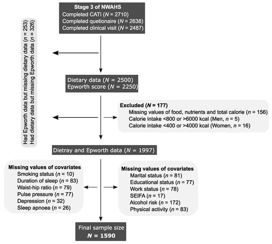 Detailed methods about the North West Adelaide Health Study (NWAHS) can be found elsewhere [,]. In brief, we used longitudinal data from the NWAHS, a community-based study in the northern and western part of Adelaide. Up till now, the NWAHS has had four stages of data collection (Stage 1, 1999–2003; Stage 2, 2004–2006; Stage 3, 2008–2010; and North West 2015 (NW15), 2015). All randomly selected households with a telephone connected and a telephone number listed in the electronic White Pages (EWPs) were originally eligible for selection in the study. Within each household, the person who had their birthday last and was aged 18 years and over was selected for an interview and invited to attend the clinic for a biomedical examination. At Stage 1, a total of 4056 participants completed a self-administered questionnaire, computer-assisted telephone interview (CATI), and clinical visits. At Stage 3, data on diet (n = 2500) and daytime sleepiness score (n = 2250) were collected. In this study, we used data from the 1590 participants who had complete information on diet, Epworth Sleepiness Scale (ESS) score, and other covariates (Figure 1).