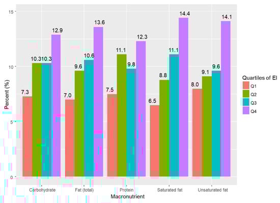 We used proportion and mean (±SD) to summarize the data descriptively. We calculated total energy intake (EI) per day in kcal from fat (1 g = 9 kcal), carbohydrate (1 g = 4 kcal), and protein (1 g = 4 kcal). The relative percentage of energy intake from these macronutrients was calculated ((EI from macronutrient/total EI) × 100%). We segregated total fat intake into saturated and unsaturated in the analysis. Quartiles of the EI from each macronutrient were determined.