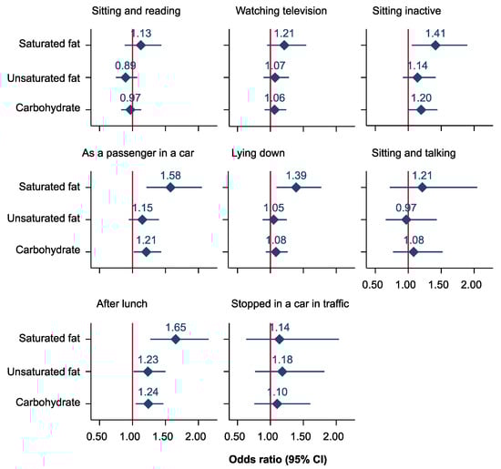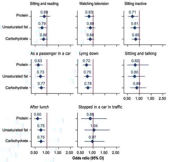 Associations of iso-caloric substitution of saturated fat and protein with individual components of ESS using the nutrient density model are depicted in Figure 3 and Figure 4, respectively. We found that iso-caloric substitution of protein with saturated fat increased the odds of an individual reporting daytime sleepiness while sitting inactive and lying down, during travel as a passenger, and after lunch. Substitution of protein with carbohydrate increased the odds of daytime sleepiness while sitting inactive, during travel as a passenger, and after lunch (Figure 3). In general, the substitution of saturated fat by protein, unsaturated fat, and carbohydrate was inversely associated with daytime sleepiness for all components of ESS except stopped in a car in traffic for few minutes (Figure 4).