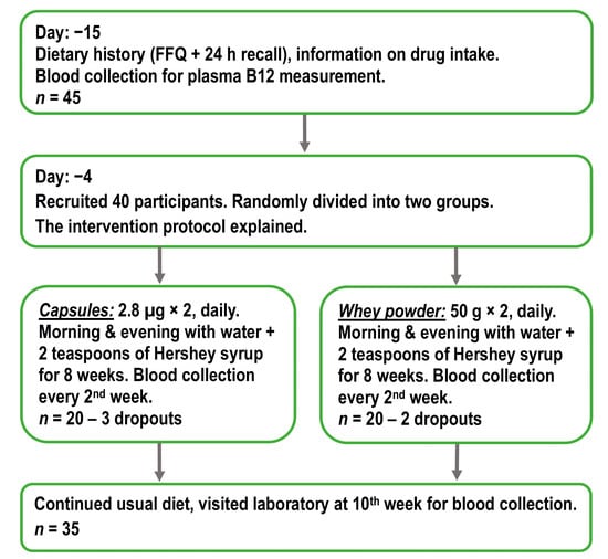 - Dhillon, V.S.; Zabaras, D.; Almond, T.; Cavuoto, P.; James-Martin, G.; Fenech, M. Whey protein isolate improves vitamin B(12) and folate status in elderly Australians with subclinical deficiency of vitamin B(12). Mol. Nutr. Food Res. 2017, 61, 1600915. [Google Scholar] [CrossRef] [PubMed]