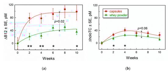 | Marker | Reference Interval * | Capsules (CN-B12) Median (min/max) n = 17 (15 Female) | Whey Powder (HO-B12) Median (Min/Max) n = 18 (8 Female) | Mann-Whitney p-Values |
