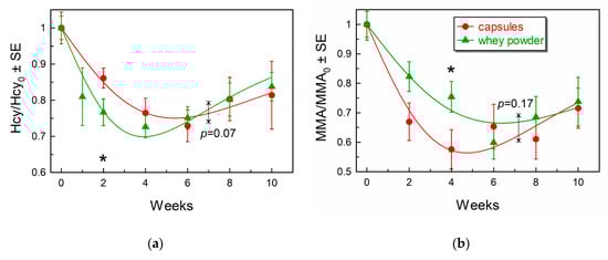 3.2. Median Biomarker Values after Four and Eight Weeks of Treatment with Capsules or Whey Powder