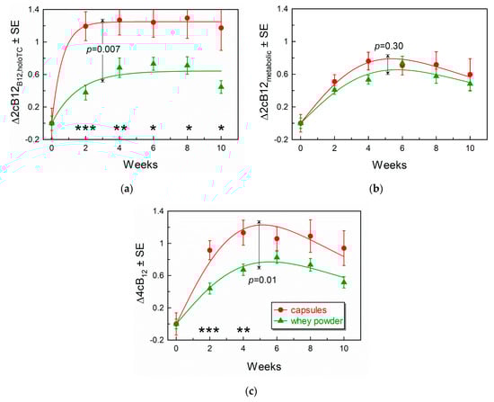 3.3. Comparison of Marker Response Curves Following Treatment with Capsules or Whey Powder