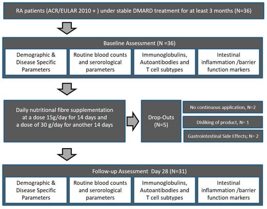From November 2018 to January 2019, a total of 36 subjects fulfilling the American College of Rheumatology/European League Against Rheumatism (ACR/EULAR) classification criteria for RA, being in clinical remission (Disease Activity Score ≤2.6) were included in this prospective study [41]. After given informed consent, all eligible patients were assessed as consecutive cases. Participants were recruited at the outpatient clinic of the Medical Department 3 of the University Clinic Erlangen, Germany, and gave written informed consent. Patients with RA according to the ACR/EULAR 2010 criteria receiving stable treatment with disease-modifying anti-rheumatic drugs (DMARDs) (conventional synthetic, targeted synthetic, or biological DMARDs) were instructed in detail on the use of the dietary supplement in addition to their regular treatment (Figure 1). All patients stayed on their initial standard medication throughout the feasibility study, and compliance was confirmed weekly based on new patient orders of further high-fiber portions. RA patients’ habitual intake of fiber was assessed using a modified version of the food frequency questionnaire (FFQ) developed for use in the German Health Examination (DEGS) Survey for Adults 2008–2011 [42], but did not change significantly (p = 0.5416) within the 28-day study period. All patients received clinical examination at baseline and 28 days, including measurement of parameters of disease activity (DAS28), physical function (HAQ-DI), and quality of life (SF-36). At baseline and 28 days, routine laboratory as well as immunologic parameters were measured as well. In addition, markers of intestinal inflammation, intestinal permeability, and adaptive T cell-related immunity were assessed at baseline and follow-up (summarized in Section 2.5). The study was approved by the Ethics Committee of Medical University Erlangen-Nürnberg (approval number 357_17B).