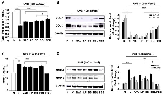 Effects of FBB on UVB-induced collagens (COL) degradation and matrix metalloproteinases (MMPs) production in Hs68 cells. Cells were stimulated with UVB (100 mJ/cm2) after incubated with the indicated doses of LP, BB, BBL, and FBB for 24 h in Hs68 cells. (A) Type I procollagen levels were measured in cell-free culture supernatants with ELISA kits. Cell lysates were analyzed by western blotting to determine the protein levels. (B) COL-1 and -3 protein levels. (C) MMP-1 levels in cell-free culture supernatants. (D) MMP-1 and -2 protein expression levels. The densitometry data represent are shown as relative density of protein bands normalized to β-actin level. *** p < 0.001 vs. normal (N, without UVB irradiation); ### p < 0.001 vs. control (C). † p < 0.05 vs. BB. Values are means ± SEM of three independent experiments.