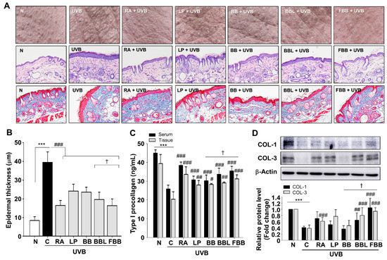 UVB irradiation induces excessive epidermal proliferation and thickness that contribute to skin roughness [20]. To investigate the effect of FBB on wrinkle formation, the dorsal skins of hairless mice were exposed UVB with LP, BB, BBL, and FBB for 4 weeks. RA (0.01%) was used as a positive control. As shown in Figure 4A, UV exposure for 4 weeks triggered skin thickening and coarse wrinkles in the model mice. However, these macroscopic changes of UV irradiated skin were ameliorated in the FBB-administered groups (Figure 4A, upper panel). The skin tissue sections were subjected to H&E staining. Skin in UV irradiation group displayed typical features of photoaging, such as irregular thickening of epidermal layer and even the presence of inflammatory infiltrates in corium and subcutis. However, FBB administration ameliorated these skin structure damages induced by UV exposure (Figure 4A, middle panel, and Figure 4B). To determine whether the treatment of FBB to UVB-irradiated SKH-1 mice affects COLs degradation, the type I procollagen levels in serum and tissue lysates, histological changes, and the protein expressions of COL-1 and COL-3 were analyzed in mice skin tissue of each group. Dorsal skins were stained with Masson’s trichrome. UVB irradiation resulted in the loose and uneven distribution of collagen fibers. Increased bundles of collagen fibers were observed in the FBB-treated group (Figure 4A, lower panel). FBB significantly maintained type I pro-collagen levels in serum as well as in tissue lysates (Figure 4C). Moreover, FBB inhibited UVB-induced COL-1 and COL-3 protein downregulations (Figure 4D). FBB significantly reserved the COLs degradation compared with BB. FBB administration shows more effective than LP, BB, and BBL, suggesting that BB may be made more potent by fermentation.
