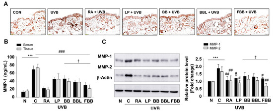 Suppression of MMP-1 expression in UVB-irradiated mouse skin by FBB. (A) Dorsal skin sections were immunostained with anti-MMP-1 antibody. The magnification was ×200. (B) MMP-1 levels were measured in serum and tissue lysates from all groups using ELISA kit. (C) The expression level of MMP-1 and -2 proteins were detected by western blotting. Each band was densitometrically quantified by image analysis. The band density was normalized to β-actin followed by statistical analysis. *** p < 0.001 vs. N; # p < 0.05, ## p < 0.01, ### p < 0.001 vs. C. † p < 0.05 vs. BB. Values are means ± SEM of three independent experiments.