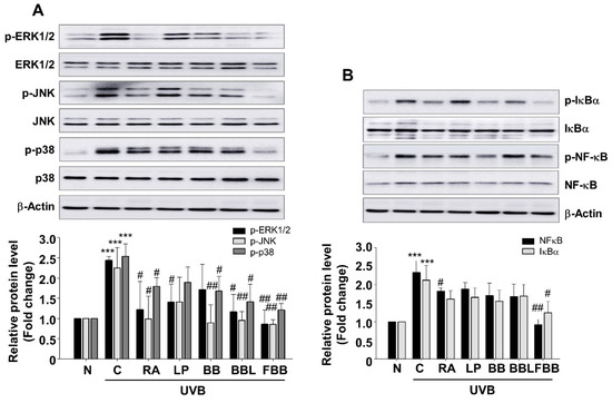 Effect of FBB on UVB-induced MAPKs and NF-κB signaling in hairless mice. (A) Western blot analysis of p-ERK1/2, p-JNK, and p-p38 expression in skin tissue lysates. (B) Western blot analysis of p-IκBα NF-κB and expression. Each band was densitometrically quantified by image analysis. The band density was normalized to each total protein followed by statistical analysis. *** p < 0.001 vs. N; # p < 0.05, ## p < 0.01, ### p < 0.001 vs. C. Values are means ± SEM of three independent experiments.
