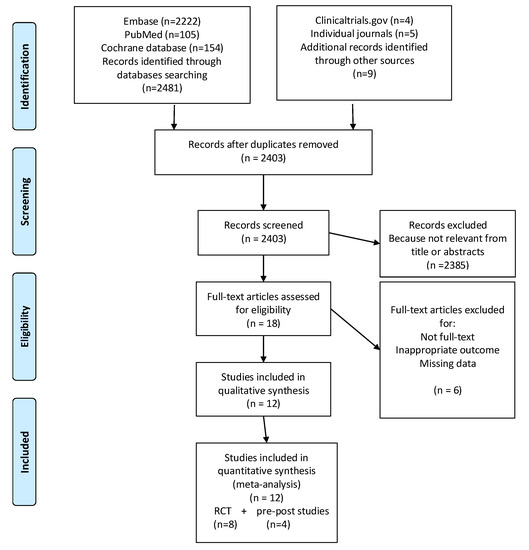 The 12 papers included in the analysis were published from 2001 to 2018. Eight studies were RCTs [53,54,55,56,57,58,59,60], and four were pre–post intervention studies [62,63,64,65].