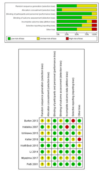 Risk of bias summary and graph. Green: low risk, yellow: unclear risk, red: high risk. In total, 50% of RCTs appropriately described the random sequence generation process, but only one reported the allocation concealment in detail. In most studies (87.5%), participants and personnel were blinded; in five studies, the outcome assessors were also blinded. Six studies out of eight had a low risk of incomplete data, with only one (Hatakka et al. 2007 [53]) being classified as having a high risk because 30% of participants dropped out during the study. Regarding selective reporting, one study (Burton et al., 2003 [60]) was judged to have a high risk because, in the article, the outcome of interest was incompletely reported. However, after e-mail contact with the authors, the reviewers received the data required. Finally, the reviewers assigned high risk to Keller et al., 2018 [55], because, as declared by authors, “fewer participants completed the study as projected, and the study was terminated before completion because of recruitment problems”.