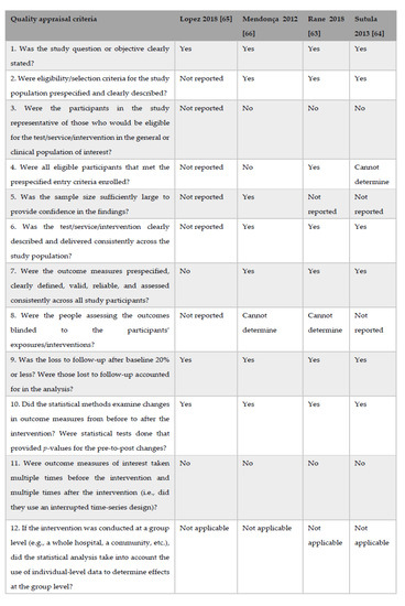 On the basis of the quality appraisal criteria proposed by the NHLBI [68] for pre–post intervention studies with no control group, the study by Lopez et al. (2018) [64] was classified as having poor quality because the paper consisted of a correspondence letter which provided poor information about the trial. The other three studies were susceptible to some bias, but not sufficient to invalidate the results (Figure 3). Thus, they were assigned to the fair quality category.