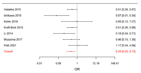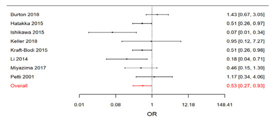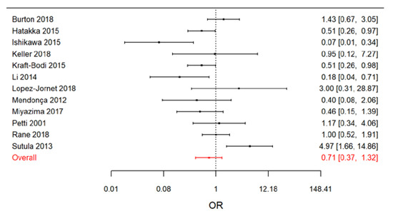 Miyazima et al. (2017) [57] conducted an RCT with three treatment arms (placebo, treatment 1 with Lactobacillus acidophilus, and treatment 2 with Lactobacillus rhamnosus). We collapsed the results for the two experimental treatments in order to obtain an overall OR of treatment vs. placebo.