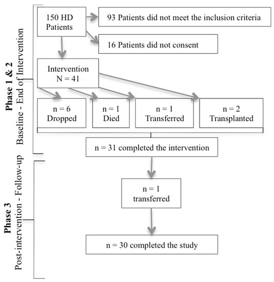 Initially, 150 HD patients were assessed for eligibility, 57 were found to be eligible (38%), and 41 consented to participate (28% refusal rate). Over the course of the intervention phase, 6 patients were not satisfied with the cycle used or the IDE itself (dropped at week 10); one patient was transferred to another HD unit at week 12, 2 patients did a transplant at week 6 and 11, and 1 patient passed away at week 10. At follow-up, 1 patient was transferred to another facility. Thus, 30 patients completed the study (Figure 1).