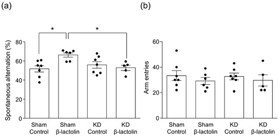In all animal experiments, β-lactolin was administered at a dosage of 1 mg/kg by oral gavage. In this study, the dosage of β-lactolin was determined according to our previous report [7]. The human equivalent dosage of β-lactolin is 0.08 mg/kg, calculated by multiplying the human equivalent dosage modulus (0.08). Either water or β-lactolin was administered 60 min prior to the Y-maze test. In the NORT and the NOLT, either water or β-lactolin was administered 60 min prior to both the acquisition period and the recall period.
