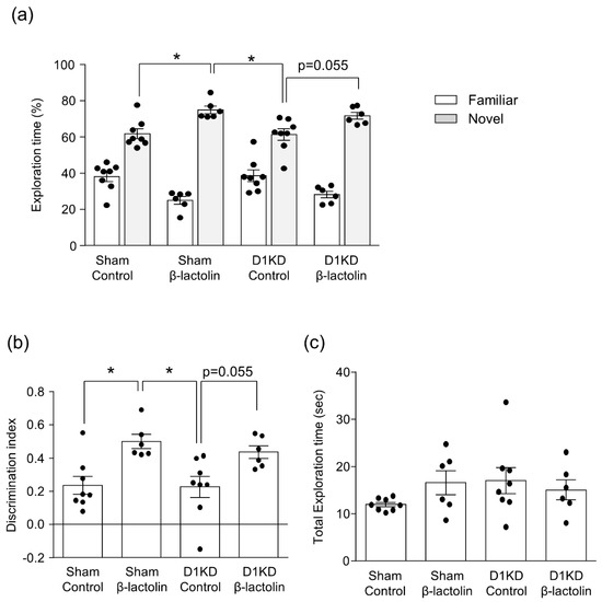 Previously, we found that β-lactolin enhances object recognition memory in the NORT [7]. Here we investigated whether the dopamine D1 receptor subtype is involved in this effect. Consistent with our previous reports, β-lactolin increased significantly both the time spent exploring a novel object and the discrimination index in the control miRNA group (F3,24 = 6.473, p = 0.0023, Figure 3a,b). The time spent exploring a novel object and the discrimination index was also increased in the D1 knockdown mice by administration of β-lactolin, though there was no significant change. The total exploration time was not affected by any treatment (F3,24 = 1.265, p = 0.3086, Figure 3c). These findings suggest partial involvement of the dopamine D1 receptor subtype in the hippocampus, though it is not vital for the effect of β-lactolin on enhancing object memory.
