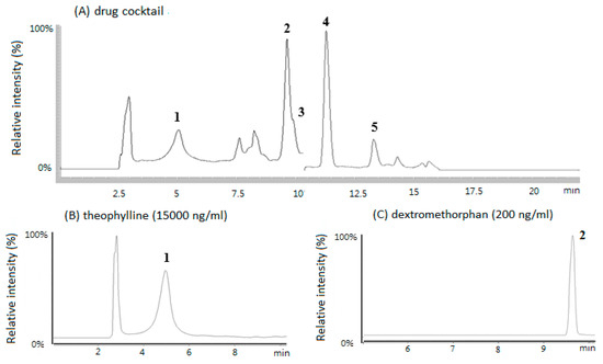 Plasma (50 μL) was mixed with 100 μL of acetonitrile. The mixture was vortexed for 30 s and then centrifuged at 21,000× g for 20 min. An aliquot (40 μL) of the supernatant was used for HPLC/MS. To prepare the samples of the calibration curve, the blank plasma (50 μL) containing various concentrations of theophylline (100–15,000 ng/mL), diclofenac (50–15,000 ng/mL), dextromethorphan (2.67–2000 ng/mL), chlorzoxazone (2.5–1500 ng/mL), or diltiazem (1.67–1000 ng/mL) was mixed with 100 μL of acetonitrile.