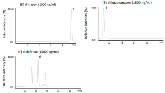 HPLC/MS (single quadrupole) selective ion monitoring chromatogram of five drugs in rat plasma (A), theophylline (B), dextromethorphan (C), diltiazem (D), chlorzoxazone (E), and diclofenac (F). Peaks: 1, theophylline; 2, dextromethorphan; 3, diltiazem; 4, chlorzoxazone; 5, diclofenac. Data acquisition was via selected ion monitoring (SIM). Details are described in Materials and Method.