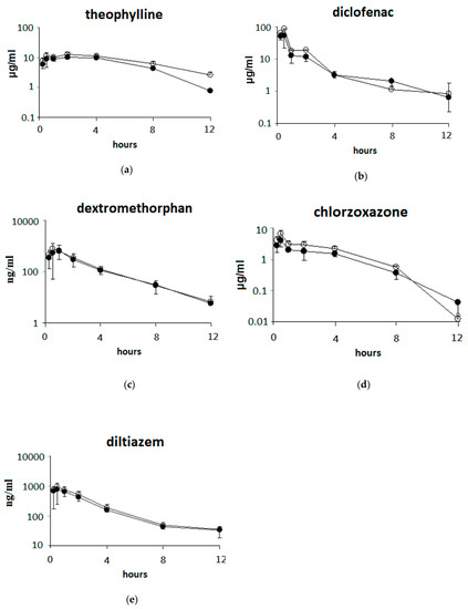 Plasma concentration–time profiles of five drugs (oral administration (PO) dosing) after administration of a single oral dose of ABO in rats. The drug cocktail (CYP1A2: theophylline (a), CYP2C: diclofenac (b), CYP2D: dextromethorphan (c), CYP2E1: chlorzoxazone (d), CYP3A: diltiazem (e) was administered orally at a dose of 5–40 mg/kg BW to rats 1 h after administration of 2.5 mg/kg BW of control oil or ABO. Values at each time point are expressed as the mean ± SD of six rats in each group. ●: Control group; ○: ABO group.