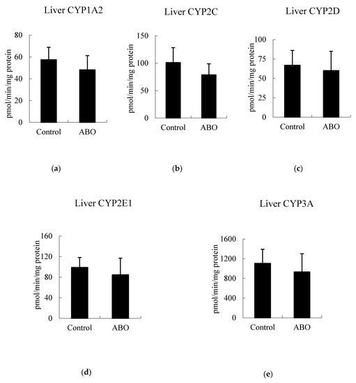 Concerning the role of the exposure time of ABO administration on CYP enzyme activity in the liver, the effects of short-term or long-term treatment may differ. In the previous study, ABO feeding (10% in the diet) for 4 weeks reduced hepatic activities of CYP1A2, 2C, 2D, 2E1, and 3A and their protein expressions [21]. It is suggested that, similar to the action of other functional foods, the modulation on CYP enzyme activity by ABO may differ with the length of intake [38,39]. Long-term ABO treatment may reduce hepatic CYP enzyme activities.