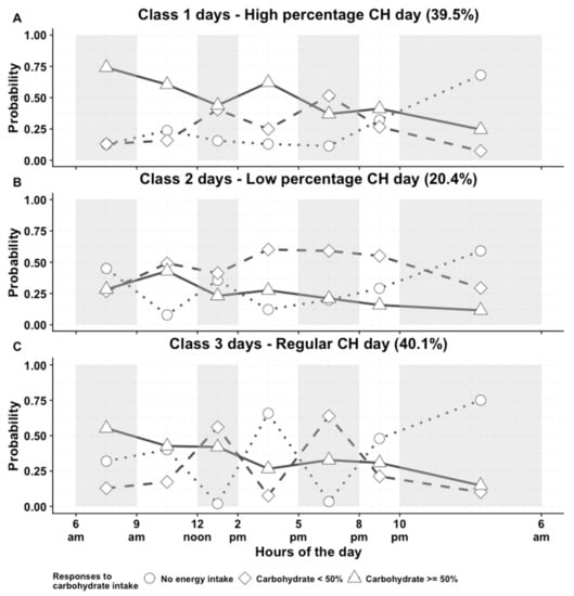 Class 2 days (Figure 1B) were named as “low percentage CH day” because between 9 a.m. and 10 pm, the probability of carbohydrates contributing <50% of energy was always the highest. In class 2 days, participants also tended to have morning snacks (p = 0.079 of no energy intake), although these may also be interpreted as having a long or late breakfast in these mornings. Also, the probability of no intake at night was the lowest for Class 2 days (p = 0.59).