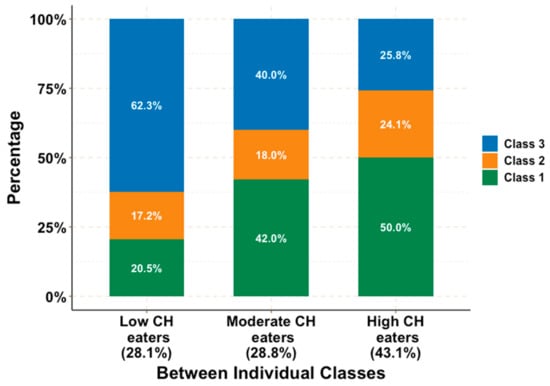 Figure 2 showed the results from the chosen MLCA model where low-CH eaters (LCE, 28.1%), moderate-CH eaters (MCE, 28.8%) and high-CH eaters class (HCE, 43.1%) were defined. In the LCE group, 62.3% of days were classified as Class 3, and only 20.5% as Class 1. MCE had comparable proportions of day Class 1 (42%) and 3 (40%) and much lower one of Class 2 (18.0%). Among HCE, nearly 50% of their days were classified as Class 1 and approximately 25.8% of days of their dietary diary were of Class 3 and 24.1% were of Class 2. Individual level classification reflects differences in the probability of following a specific day-level class so that individuals with similar probabilities of following the day level classes were grouped together. During their 4-day-diary, all types of CH eaters have more than one class of CH eating day, and this is reflected in sizeable conditional probabilities (proportions) for each type of day.