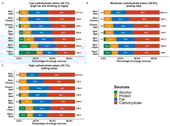 The compositions (%) and absolute (kJ) energy consumption within each time slot by individual level carbohydrate eating classes: (A), low carbohydrate eaters (LCE); (B), moderate carbohydrate eaters (MCE); (C), high carbohydrate eaters (HCE).