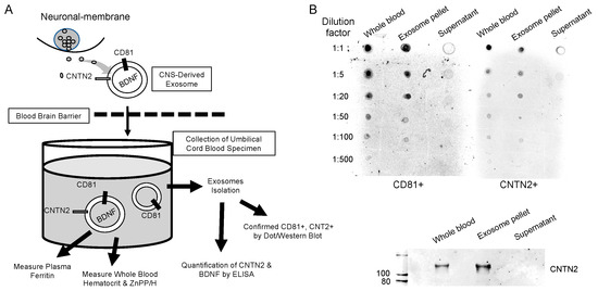 Flowchart of experimental study and validation of exosomal isolation. (A) Flowchart depicting methodology in brief. (B) Dot blot depicting qualitative levels of CD81 and CNTN2 within whole blood, the exosome pellet, and the supernatant. Bottom panel shows a Western blot image depicting qualitative levels of CNTN2 within those same three groups.