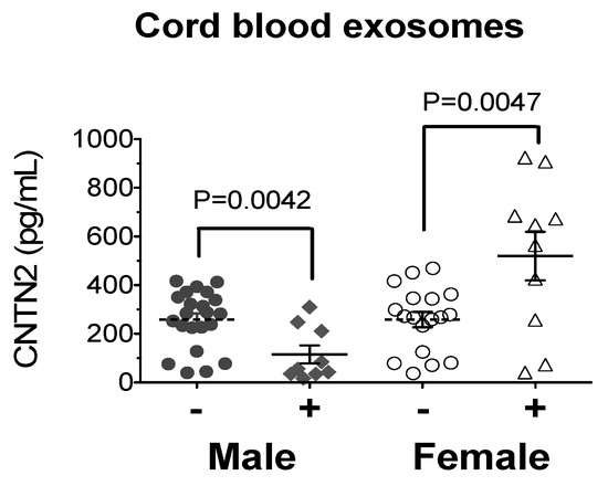 Cord blood exosomal CNTN2 and BDNF levels were quantified by ELISA. CNTN2 levels were determined using DuoSet Human CNTN2/TAG1 ELISA Kit (DY1714-05) and DuoSet ELISA Ancillary Reagent Kit (DY008) using the protocol provided (R & D Systems). BDNF levels were determined using Quantikine Total BDNF ELISA Kit (DBNT00) using the protocol provided (R & D Systems). CNTN2 and BDNF protein concentrations were determined using standard curves (CNTN2 R2 = 0.96−0.99, BDNF R2 = 0.99) created using the optical density of known concentrations of a standard solution per the manufacturer’s protocols, and a best fit line was generated using linear regression analysis. The flowchart of experimental study and the validation of exosomal isolation are shown in Figure 1. The levels of exosomal CNTN2 and BDNF in 50 µL of cord blood samples were calculated using the following formula: