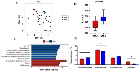 Gut microbiota composition and diversity according to metabotypes (UM-A and UM-B) before the intervention (T0). (A) Redundancy analysis (RDA) on the genus level. (B) Gut microbial richness was measured by Chao index. (C) Linear discriminant analysis (LDA) effect size (LEfSe) plot of taxonomic biomarkers identified in the gut microbiome of volunteers. (D) Relative abundances on genus level in UM-A and UM-B. ANOVA test was used to test significance differences in the relative abundances according to metabotype. Results are presented as mean ± SD. Significant differences (p < 0.05) are marked with an asterisk (*).