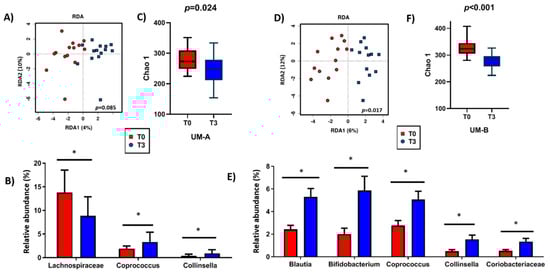 Baseline microbiota (T0, n = 27) was characterized by the presence of Firmicutes with a mean relative abundance and SD of 77.31% ± 2.88, followed by Bacteroidetes (15.86% ± 0.28), Actinobacteria (3.13% ± 0.65), Verrucomicrobia (1.78% ± 1.22), and Proteobacteria (1.31% ± 1.50) at the phylum level. The relative abundance of phylum Synergistetes was significantly enriched in UM-B (p < 0.05) compared to UM-A. At the family level, the family Lachnospiraceae was associated with UM-A, whereas the abundance of the families Cerasicoccaceae, Peptostreptococcaceae, Synergistaceae, and Paraprevottelaceae were related to UM-B. A redundancy analysis (RDA) on genus level showed significant differences in the microbial population, according to UMs (p = 0.025) (Figure 1A). Volunteers belonging to UM-B had a higher richness (p = 0.003, Chao 1 index) than UM-A (Figure 1B).
