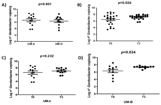 Microbiota composition before (T0) and after the intervention (T3). Gordonibacter levels measured using qPCR according to UMs before the intervention (A). Gordonibacter levels before and after the intervention for all the participants (B). Gordonibacter levels before and after the intervention for UM-A (C) and UM-B participants (D). Paired t-test was used to test significance differences in Gordonibacter levels before and after the intervention. Results are presented as mean ± SEM.