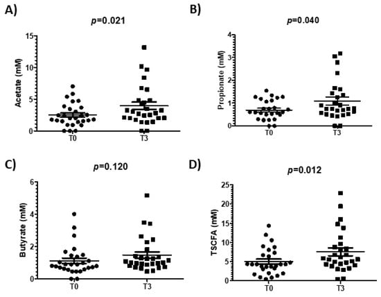 Before the intervention, volunteers belonging to UM-A tended to present higher levels of butyrate (p = 0.070). After the intervention, we did not find significant differences in SCFA production after walnut consumption according to UMs (data not shown), but analyzing all participants as a single group, the walnut intake increased the total SCFA (p = 0.012) levels, specifically acetate (p= 0.021) and propionate (p = 0.040) (Figure 4).