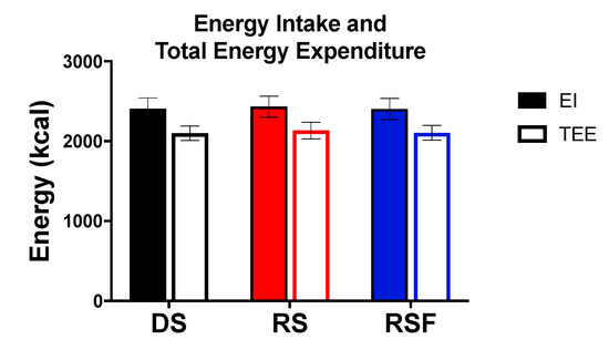 In this study, participants may have been under-fed by up to 65 kcal/1000 kcal, or 130 kcal for a 2000 kcal/day diet, in the RS conditions as all starches were included as 4 kcal/g. This is within acceptable limits for energy balance studies which is considered intake within 150 kcal of TEE per day because the lowest absolute error for whole room indirect calorimetry is 119 ± 16 kcal/day [
