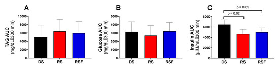 The lower insulin areas under the curve for RS and RSF relative to DS were driven by significantly higher insulin concentration, despite equivalent glucose concentration, in DS at the 300 min time point only. The second test meal, lunch, was given at 4.5 h (270 min). Thus, this improvement in insulin sensitivity or action with RS and RSF ingestion that happens at 300 min is indicative of a subsequent meal effect. The subsequent meal effect (or second meal effect) describes the ability of food intake at a single meal to influence postprandial glycemia at the next meal. Although we observed a difference in insulin rather than glucose responses, it is plausible that this effect, like glycemia in the subsequent meal effect, is driven by fermentation of RS. At five hours, this effect is in concordance with data showing that the time frame for fermentation of RS occurs 5–11 h after a meal in healthy adults [